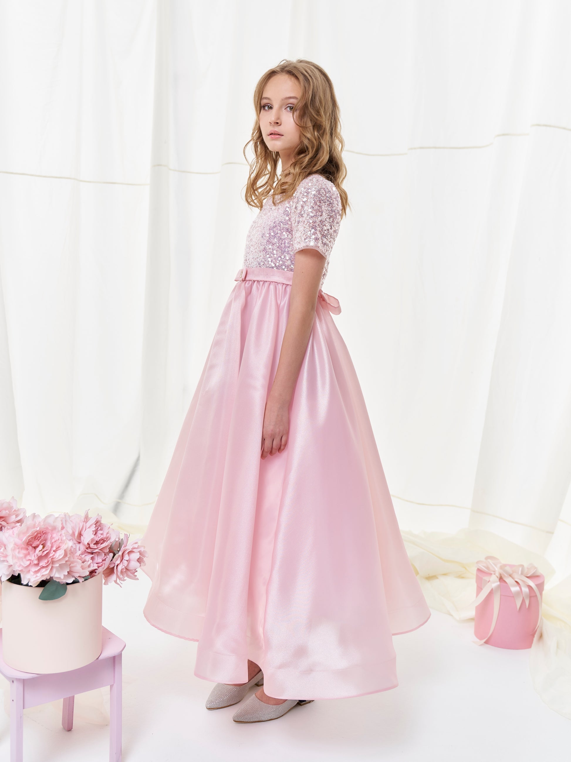 The top of the dress is made of fabric embroidered with sparkling sequins, which shimmer beautifully with every movement. A light satin belt with miniature embellishment accentuates the waist, adding sophistication to the look.